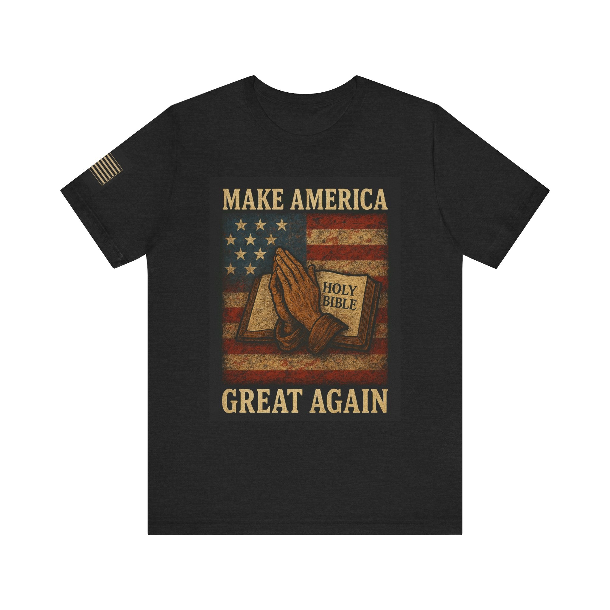 Faith inspired patriotic design for Making America great again. This unisex jersey short sleeve tee is perfect for those who want to show their love for their faith and country. Ideal for casual wear, patriotic holidays, and political events.